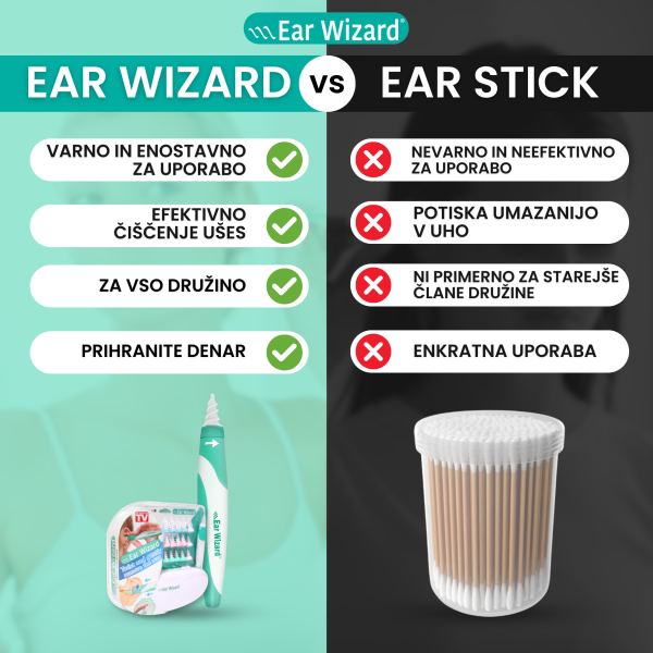Predstavljamo vam Ear Wizard – inovativni pripomoček za čiščenje ušes. Ear Wizard je eden najudobnejših in najvarnejših pripomočkov za čiščenje ušesa. Samo namestite ga v uho, zavrtite in tako nežno odstranite maslo. Tako enostavno je to! Z vatirano palčko običajno potisnemo maslo in umazanijo še globlje v uho, tako da nastane čep, ki oslabi naš sluh, v najslabšem primeru pa lahko s palčko celo predremo bobnič. Ear Wizard je zasnovan tako, da gre ravno dovolj globoko v uho, kjer se z vrtenjem ujame odvečno maslo in ga varno odstrani brez nevarnosti poškodb.