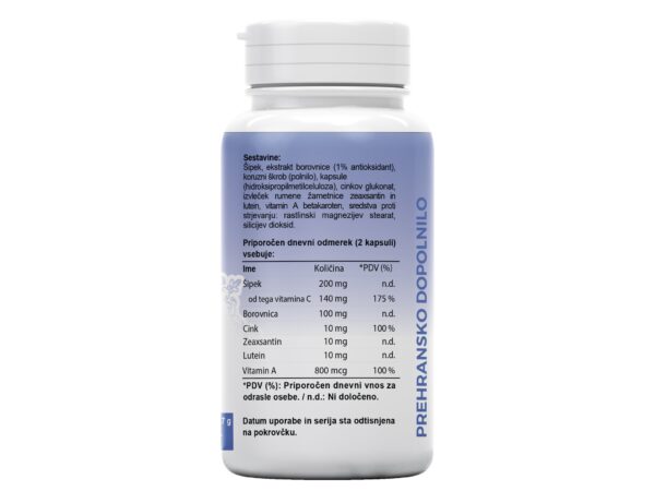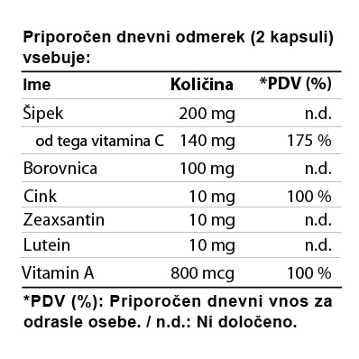 Prehransko dopolnilo z vitamini C in A, luteinom, zeaksantinom, ekstraktom borovnice in cinkom.
