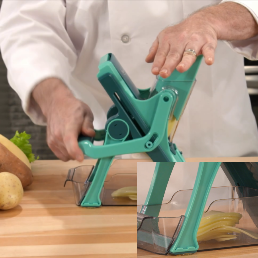 Nemška Slide N Glide tehnologija nadomesti zamudno rezanje z nožem in deskami - profesionalno narezana zelenjava v minutah.